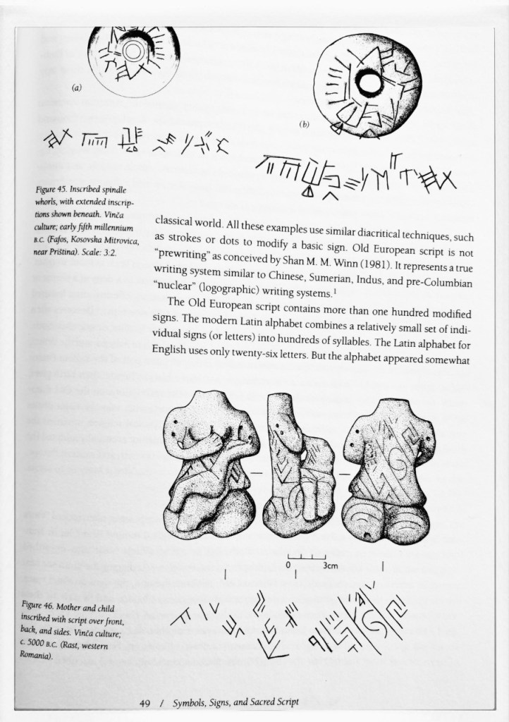 Here are some pages from the book illustrating images of goddesses figurines excavated in various parts of Europe and examples of Old European script (the Vinča culture, the Balkans).