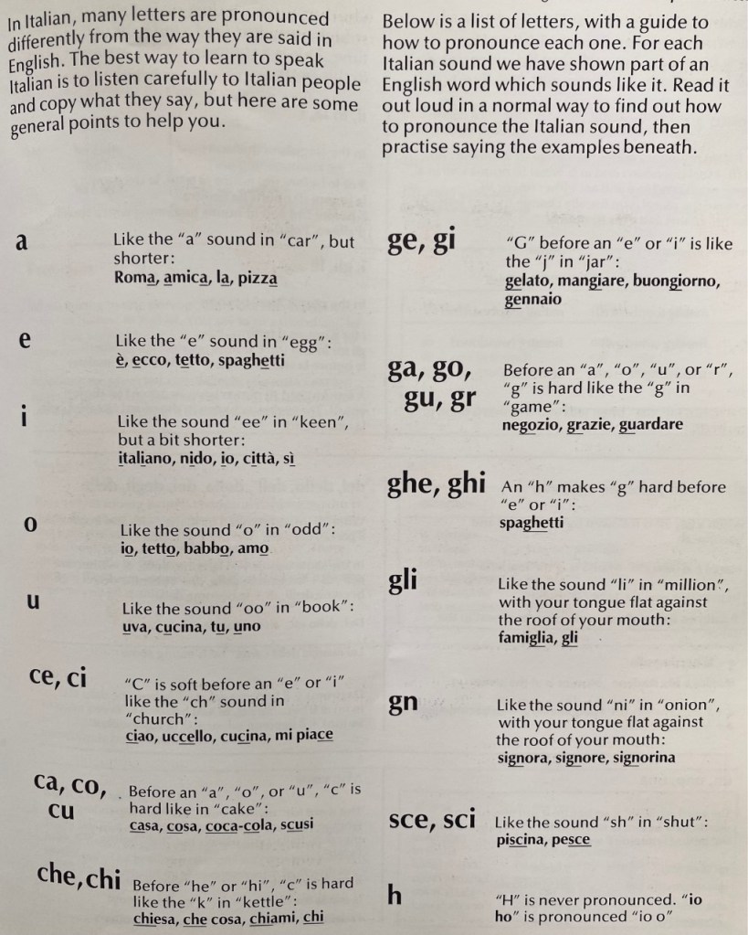 English words of Italian origin are bank, manage, umbrella, balcony, malaria, volcano, and inferno. Let’s not forget the music words such as piano, viola, opera, aria. These are easy to pronounce regardless of the language it is used in, aren’t they? Watch out for false cognates like stanza which in Italian means not only a verse as in English, but first and foremost a room, apartment, or guidare – to drive and guardare – to look, watch.